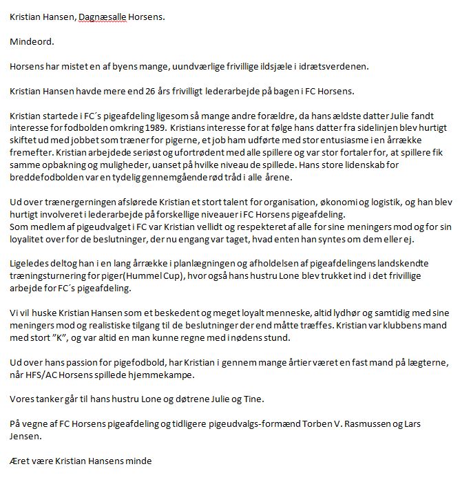 Mindeord for Kristian Hansen