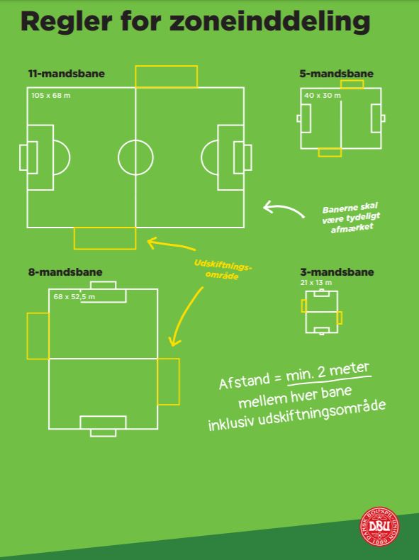 Men der må ikke være tilskuere/forældre til stede på arealerne mellem banerne under træningen, idet arealet så regnes som en bane, hvor der kun må være 50 personer.
