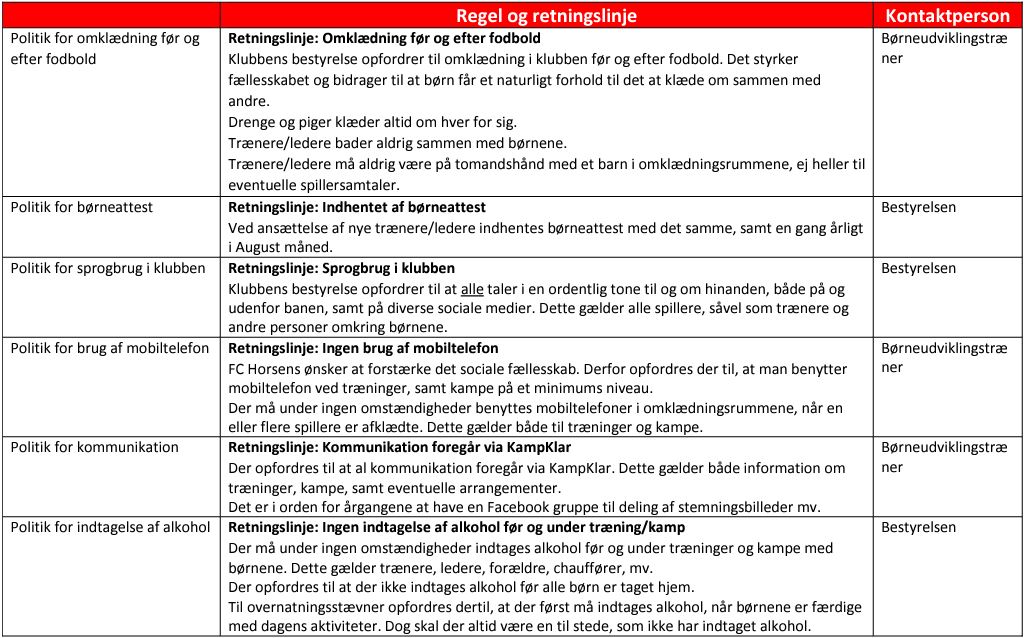 I FC Horsens er der udarbejdet en række regler og retningslinjer, læs dem her: