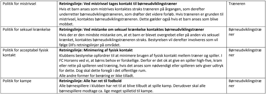 Herunder kan du læse børnepolitikken for FC Horsens: De ansvarlige for børnefodbolden i FC Horsens handler altid pa baggrund af og i overensstemmelse med DBUs børnesyn. FC Horsens har udarbejdet nedenstående børnepolitik, samt FC Horsens værdier og holdninger, for at sikre, at alle børn trygt og sikkert kan omgås i FC Horsens.