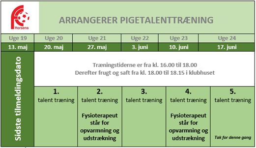 FC Horsens tilbyder i foråret 2016 (uge 20, 21, 22, 23 og 24) pigespillere på årgang U12-U15 talenttræning bestående af 5 træningspas. Talenttræning er et tilbud til spillere og målmænd, som